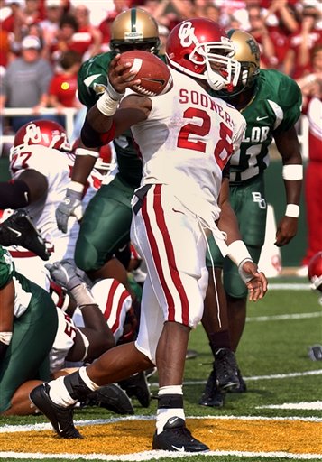 Adrian Peterson had 32 carries for 240 yards, and 3 TD. OU beat Baylor 35-0. Adrian Peterson was incredible. AD is in a class by himself.