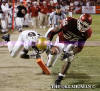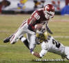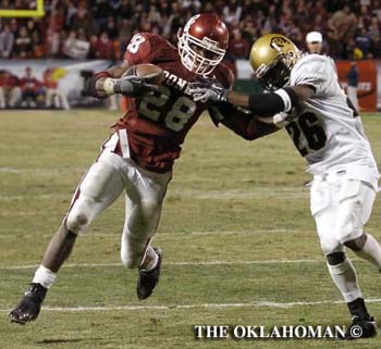 Kansas City, Mo. - With an admonishment from Oklahoma quarterback Jason White to "not go tip-toeing in there," running back Adrian Peterson slammed off right tackle, broke outside, met Colorado cornerback Terrence Wheatley around the 7-yard line and stiff-armed him all the way to the end zone.